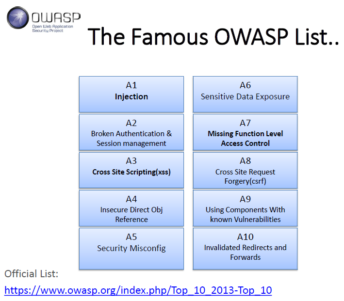 The famous top 10 are one of the most important parameters to have a closer look as they can be considered as a check list while conducting Vulnerability Assessment and Penetration testing.